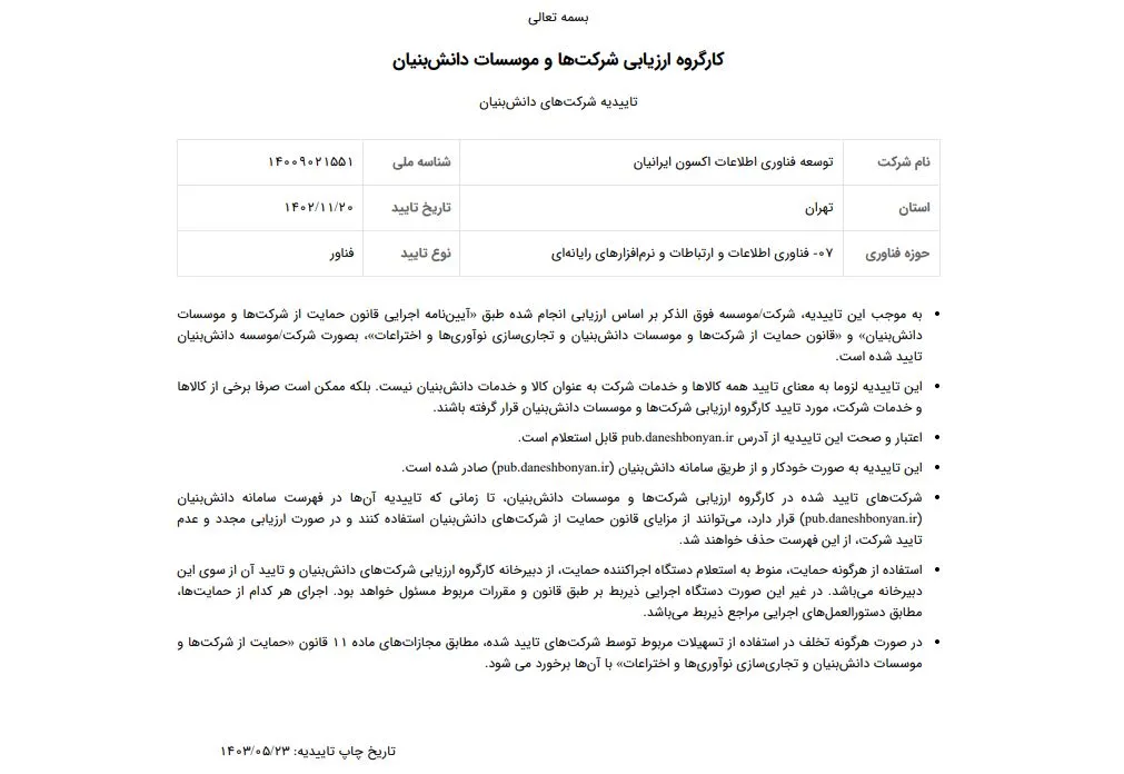 شرکت اکسون با بهرهگیری از فناوریهای پیشرفته و ایجاد محصولات رقابتی، موفق به کسب مجوز دانشبنیان نوع "فناور" شده است. این دستاورد نشاندهنده توانمندیهای علمی و تکنولوژیکی شرکت در حوزه تحقیق و توسعه و تعهد آن به نوآوریهای مستمر است. با دریافت این مجوز، شرکت اکسون به عنوان یکی از شرکتهای پیشرو در عرصه فناوریهای نوین در حوزهی بازار سرمایه شناخته میشود و گامهای مهمی در جهت ارتقاء سطح کیفی محصولات و خدمات خود برداشته است.